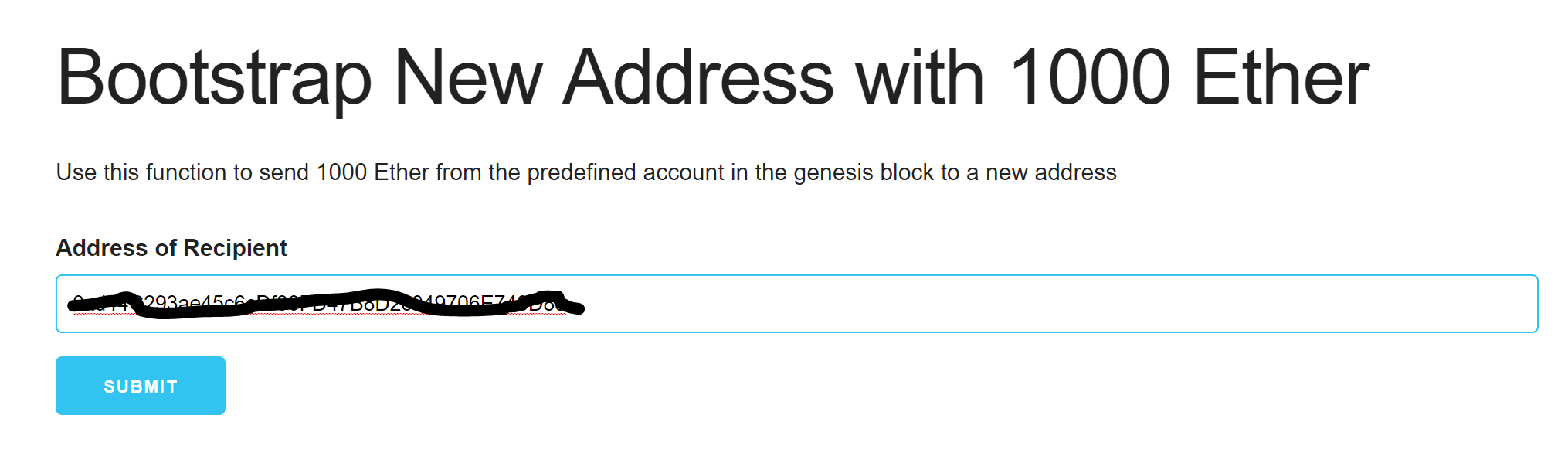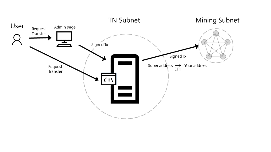 Through the administrator page, you can formulate a transaction to transfer Ether from the pre-allocated account on the Consortium network to another Ethereum account. This Ether transfer is a transaction that is sent to the transaction node and mined into a block as illustrated below.